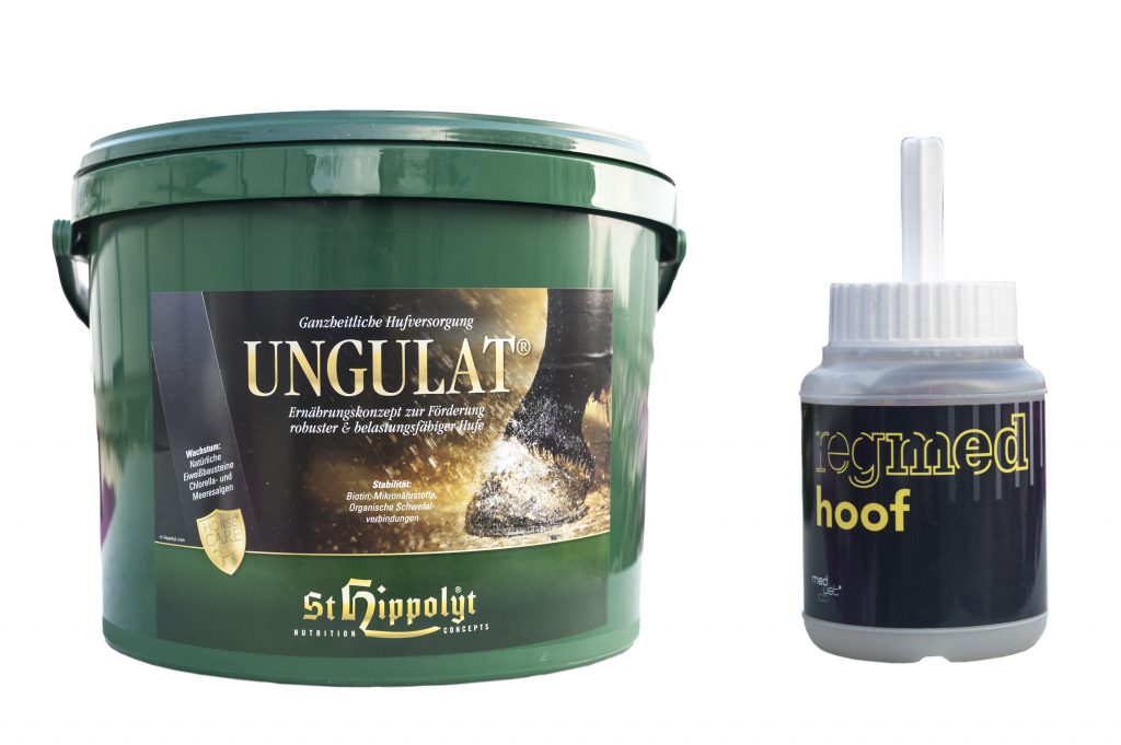 Zestaw zawiera topowy produkt firmy St. Hippolyt UNGULAT oraz najnowszy produkt marki Medvetico Regmed hoof®, który jest silnie regenerującym żelem do kopyt opartym o innowacyjną formułę na bazie naturalnych składników odżywczych.